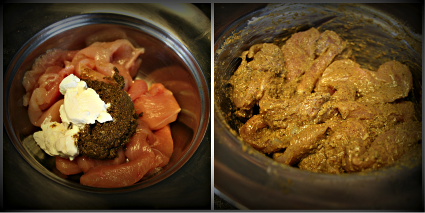 STEG 1 : Bland sammen paste og yoghurt, tilsett kylling kuttet i strimler.
