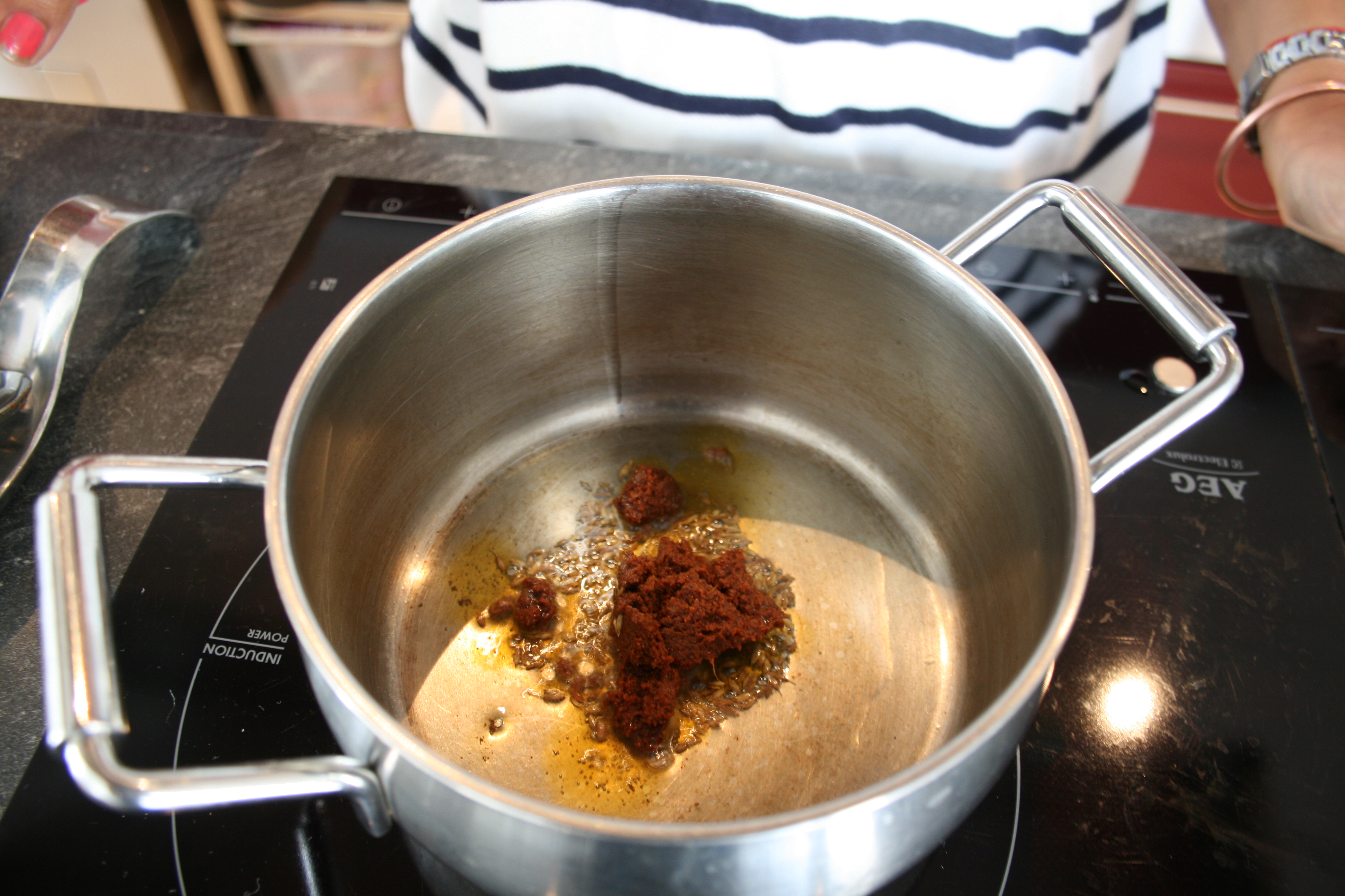 Bland olje, spisskummen og Nirus Curry paste i en kjele.