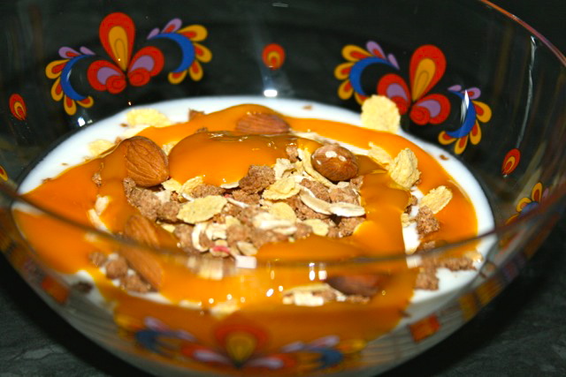 Her er min deilige frokost med laktosefri yoghurt, musli, mandler og 2 ss mango puré. Enkelt, raskt, mettende og kjempegodt!